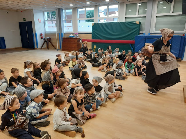 Després vam tenir una sorpresa a la Fusteria: un teatre de la Castanyada! Hi havia fades de la tardor, el gegant del Castanyer, un cargol, el Marrameu i castanyeres. Al final vam cantar, ballar i ens ho vam passar molt bé.