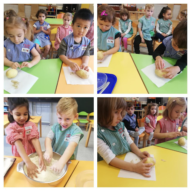 Abans de celebrar la Castanyada calia preparar els panellets. Amb les mans ben netes i polides vam pelar patates, vam barrejar la massa i vam preparar uns panellets preciosos, ben guarnits amb pinyons, ametlles i codonyat.